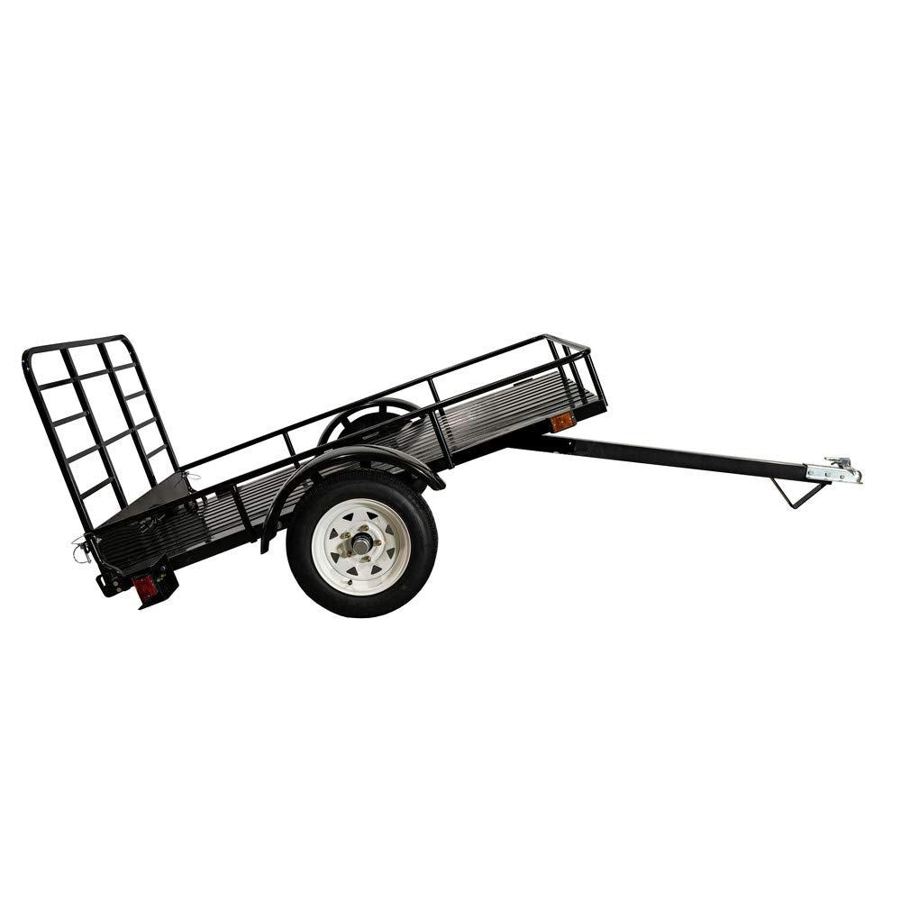 The open rail design allows for flexible loading and securing of materials such as garden equipment, tools, and general cargo. Pneumatic tires offer stable movement across uneven surfaces, making the trailer suitable for yard and light utility applications. Designed for compatibility with standard trailer hitches, this utility trailer provides a practical solution for routine transport needs.