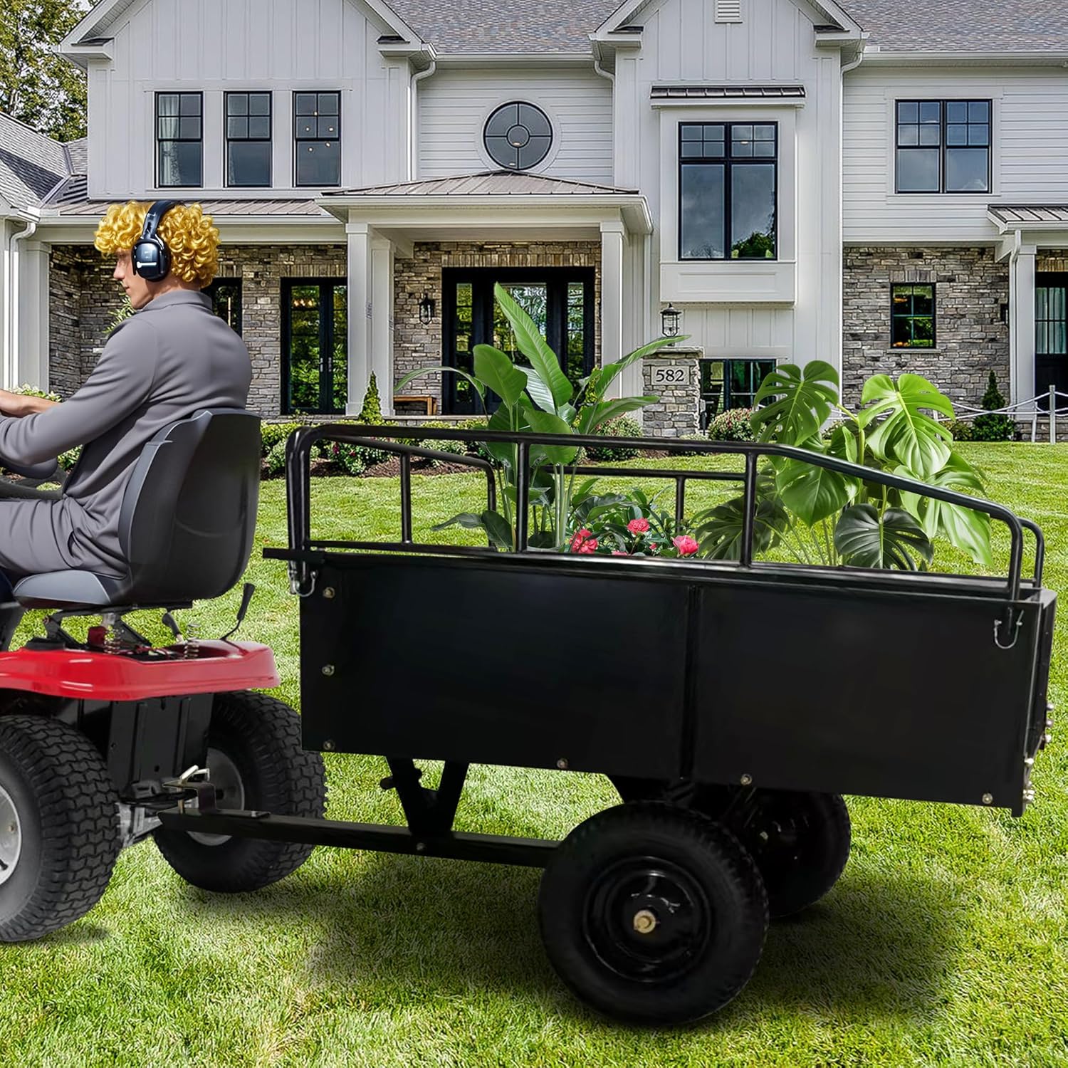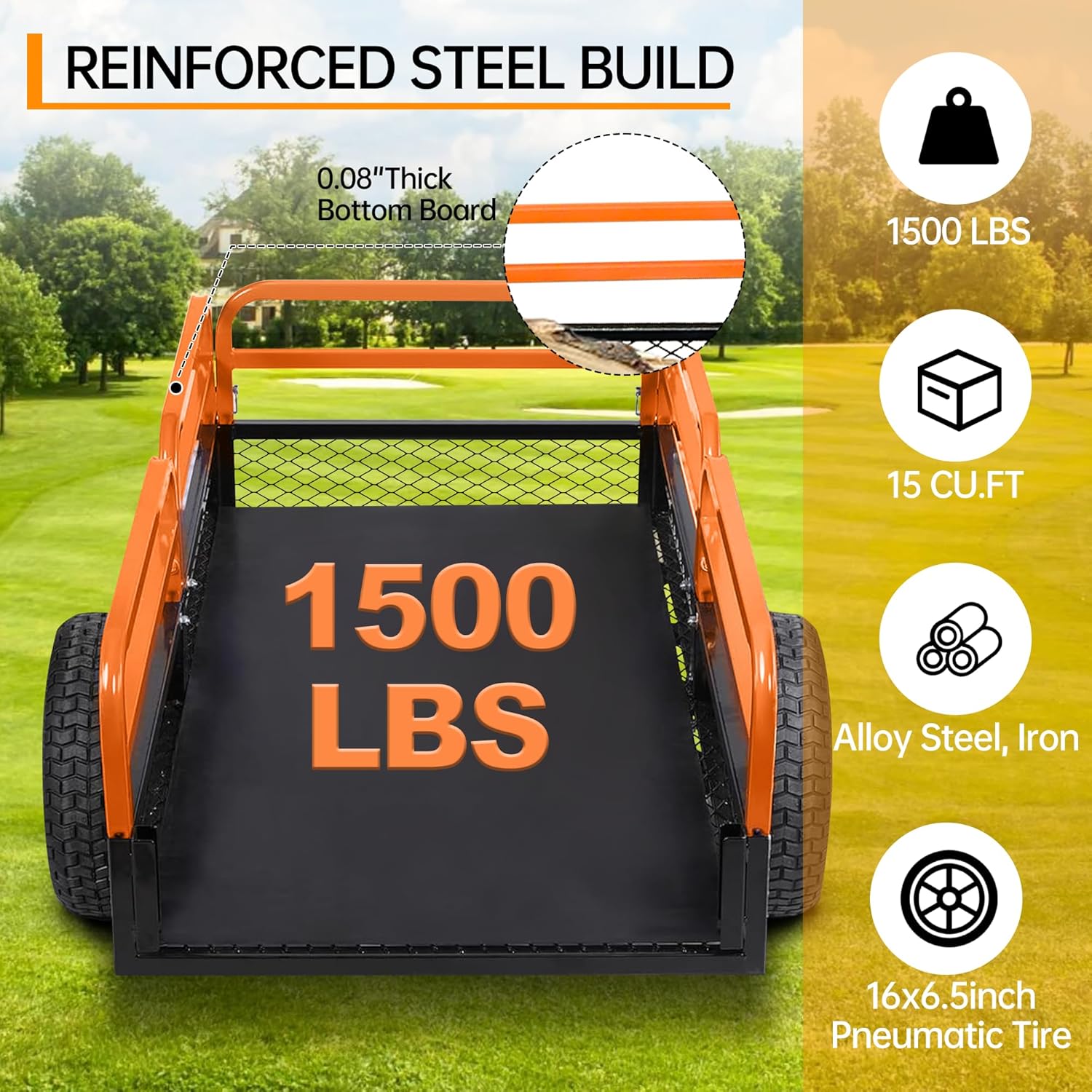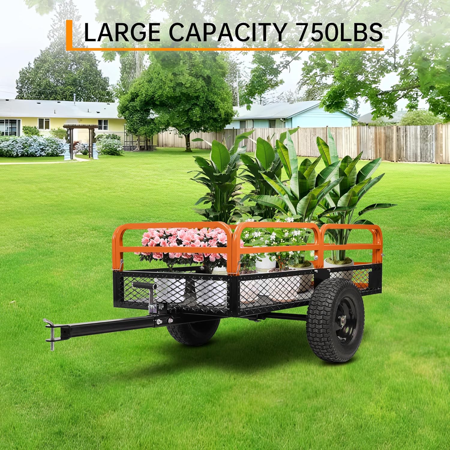 This heavy-duty steel dump cart utility trailer is designed for transporting materials such as soil, mulch, wood, tools, and garden waste in yard, outdoor, and light agricultural environments. With an approximate load capacity of up to 1,500 lbs and around 15 cubic feet of hauling space, this trailer provides a practical hauling solution for residential and utility tasks. The solid steel frame and removable side panels allow flexible loading and secure transport of materials. Equipped with rugged pneumatic tires and a standard trailer hitch, this trailer is suitable for use with lawn mowers, tractors, ATVs, and similar towing equipment.