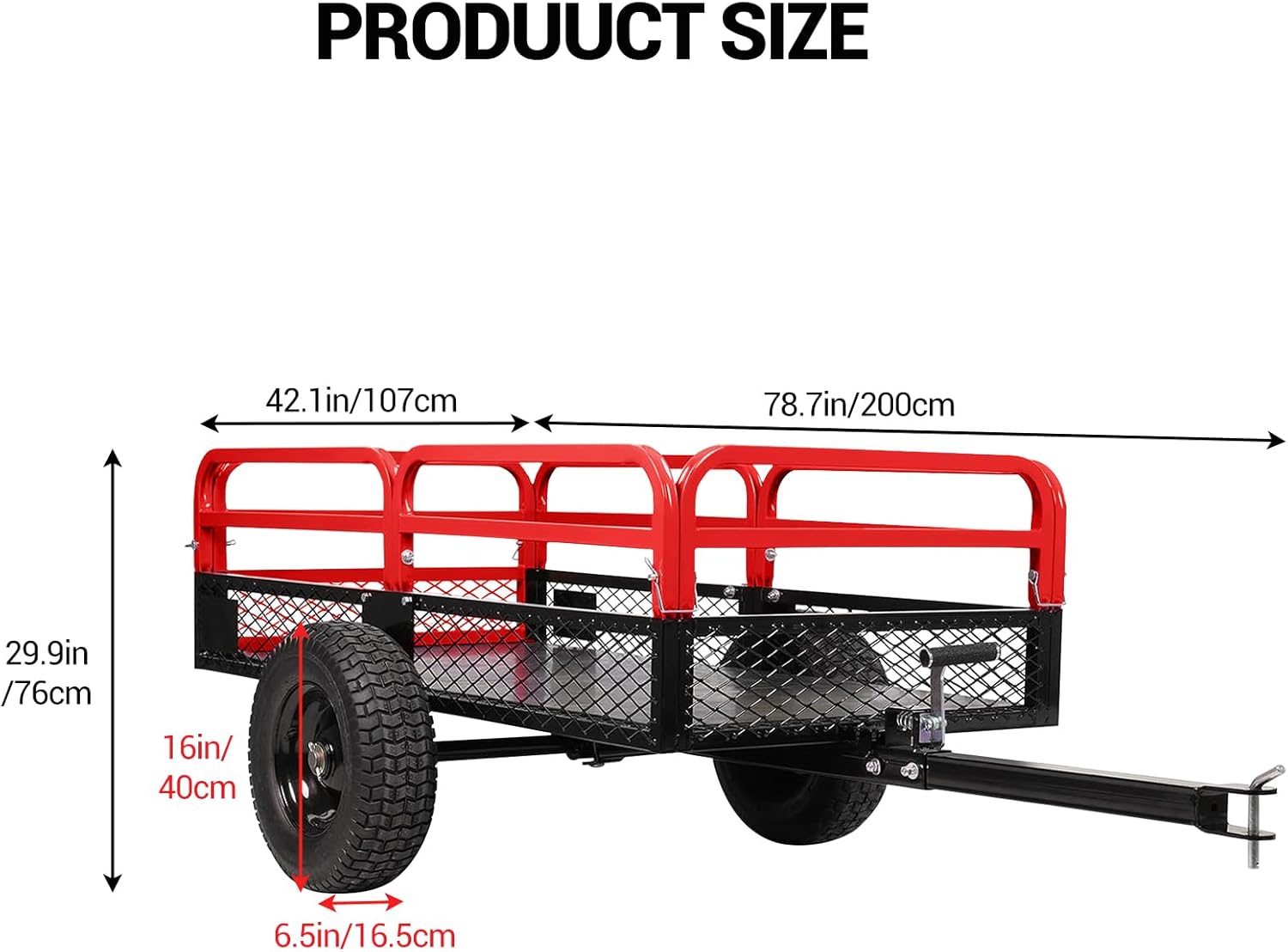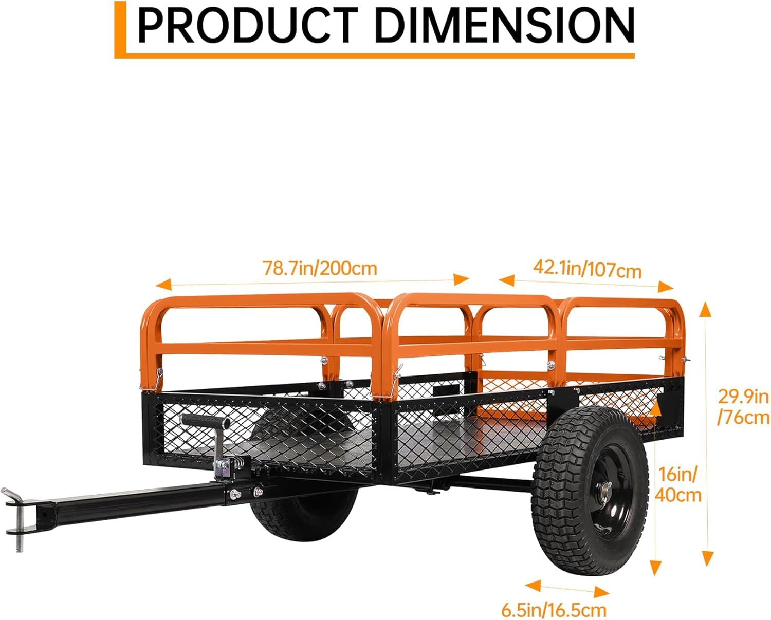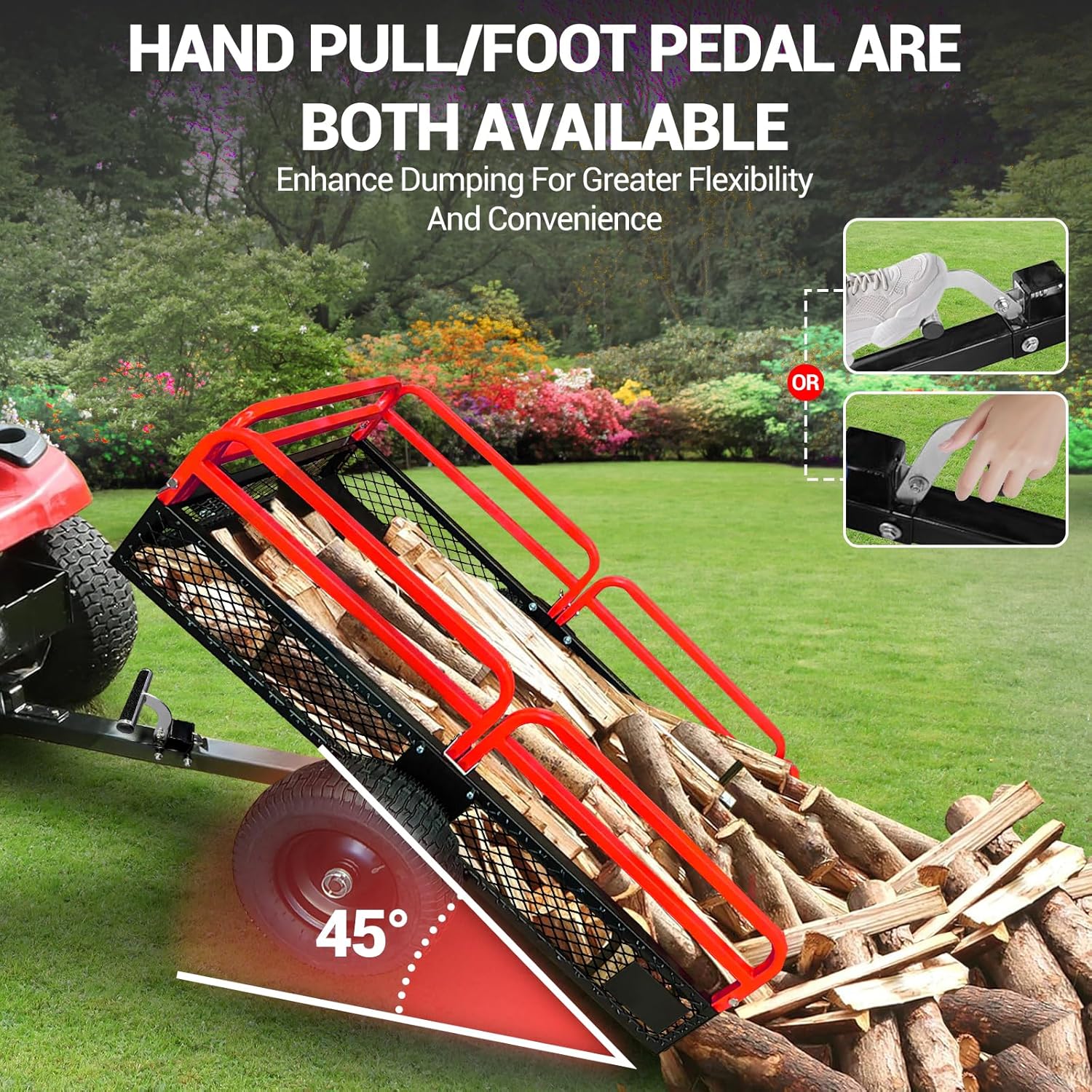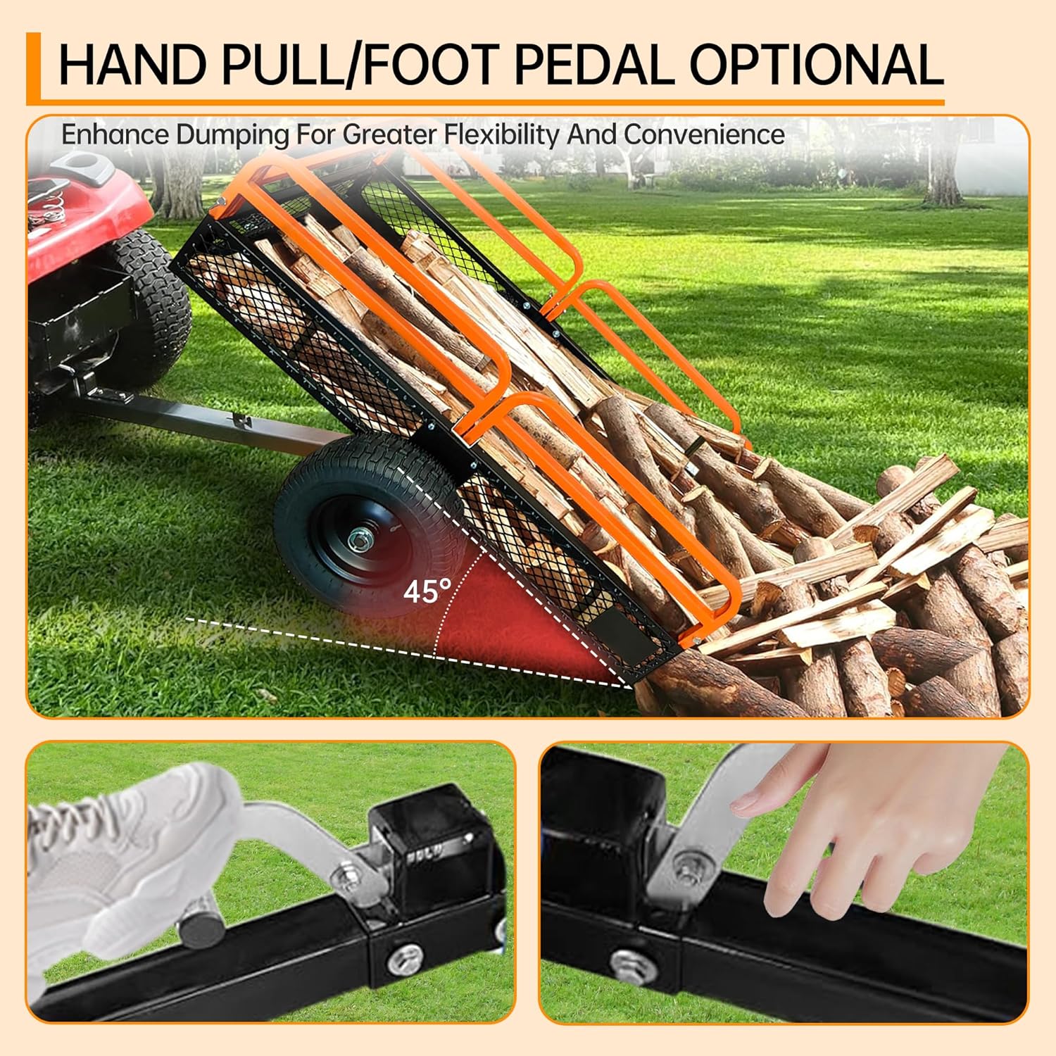 This heavy-duty steel dump cart utility trailer is designed for transporting materials such as soil, mulch, wood, tools, and garden waste in yard, outdoor, and light agricultural environments. With an approximate load capacity of up to 1,500 lbs and around 15 cubic feet of hauling space, this trailer provides a practical hauling solution for residential and utility tasks. The solid steel frame and removable side panels allow flexible loading and secure transport of materials. Equipped with rugged pneumatic tires and a standard trailer hitch, this trailer is suitable for use with lawn mowers, tractors, ATVs, and similar towing equipment.
